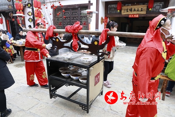 庖湯會的重點是吃“庖湯宴”。下午四點,庖湯宴正式開席。賓客8人一組圍桌而坐,28道石泉庖湯宴美食依次登場上桌,說菜人口吐蓮花,菜越說越香;酒歌高亢,越喝越暖;競拳激烈,秦巴漢子劃出豪邁風采;作坊小鎮(zhèn)聲動震天,年味香飄十里。