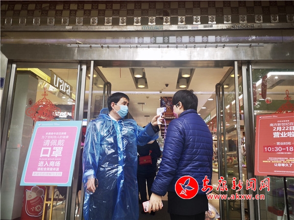 隨后,記者來(lái)到南方新世紀(jì)商場(chǎng),顧客們?cè)谏虉?chǎng)門(mén)口逐一進(jìn)行測(cè)體溫、填信息、做消毒等入店前的準(zhǔn)備工作。