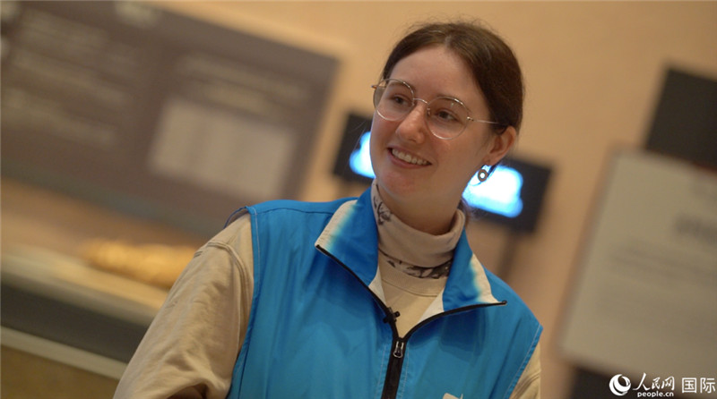 麥安琪在良渚博物院擔(dān)任講解志愿者。人民網(wǎng)記者 袁蒙攝