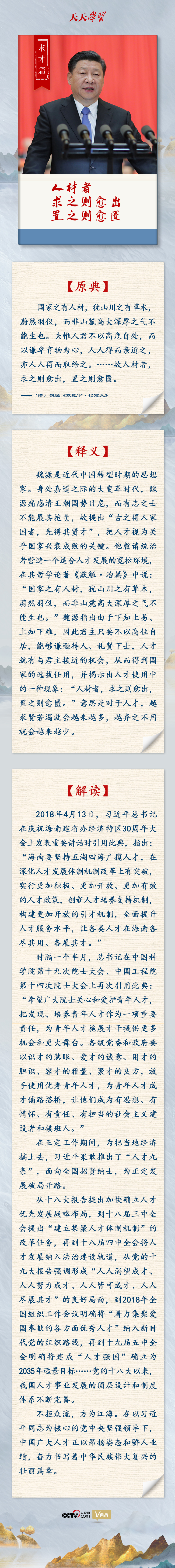 編者按:中央人才工作會(huì)議9月27日至28日在北京召開,習(xí)近平總書記出席會(huì)議并發(fā)表重要講話。黨的十八大以來,總書記站在黨和國(guó)家事業(yè)發(fā)展全局的戰(zhàn)略高度,對(duì)我國(guó)人才事業(yè)發(fā)展作出一系列重要指示。在講話和文章中,他大量引用有關(guān)中國(guó)古代人才思想的典故,就如何選才、敬才、求才、育才、用才等話題,提出了一系列新思想、新觀點(diǎn)、新論斷、新要求,為新時(shí)代做好人才工作提供了根本遵循和行動(dòng)指南。《天天學(xué)習(xí)》帶您一起學(xué)習(xí)回顧。