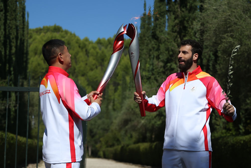 10月18日,希臘高山滑雪運(yùn)動(dòng)員揚(yáng)尼斯·安東尼烏(右)將火種傳遞給第二名火炬手——前中國短道速滑運(yùn)動(dòng)員李佳軍。新華社記者 鄭煥松 攝