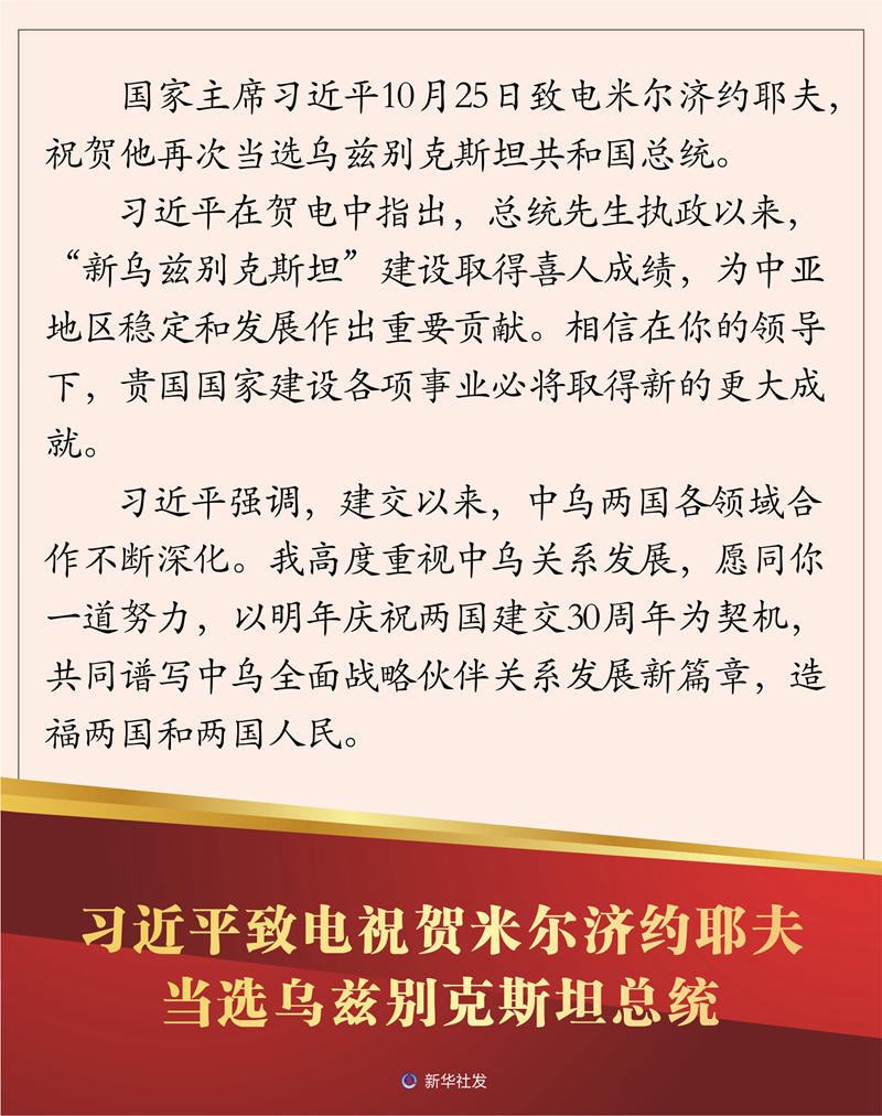 新華社北京10月26日電 國家主席習(xí)近平10月25日致電米爾濟(jì)約耶夫,祝賀他再次當(dāng)選烏茲別克斯坦共和國總統(tǒng)。