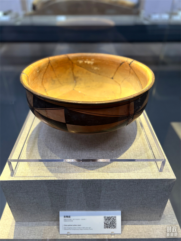 △運(yùn)城博物館內(nèi)展出的仰韶文化早期的彩陶盆。(總臺央視記者邢彬拍攝)