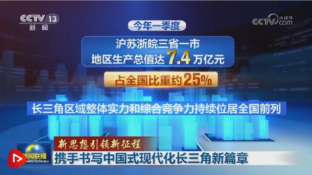 長三角地區(qū)以4%的國土面積,集聚了全國約17%的人口,創(chuàng)造了全國近1/4的經(jīng)濟(jì)總量,是經(jīng)濟(jì)最活躍、開放程度最高、創(chuàng)新能力最強(qiáng)的區(qū)域之一。今年一季度,滬蘇浙皖三省一市地區(qū)生產(chǎn)總值達(dá)7.4萬億元,占全國比重約25%,長三角區(qū)域整體實力和綜合競爭力持續(xù)位居全國前列。