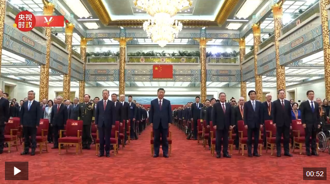 9時58分,在歡快的樂曲聲中,習近平同國家勛章和國家榮譽稱號獲得者一同步入會場,全場起立,熱烈鼓掌。