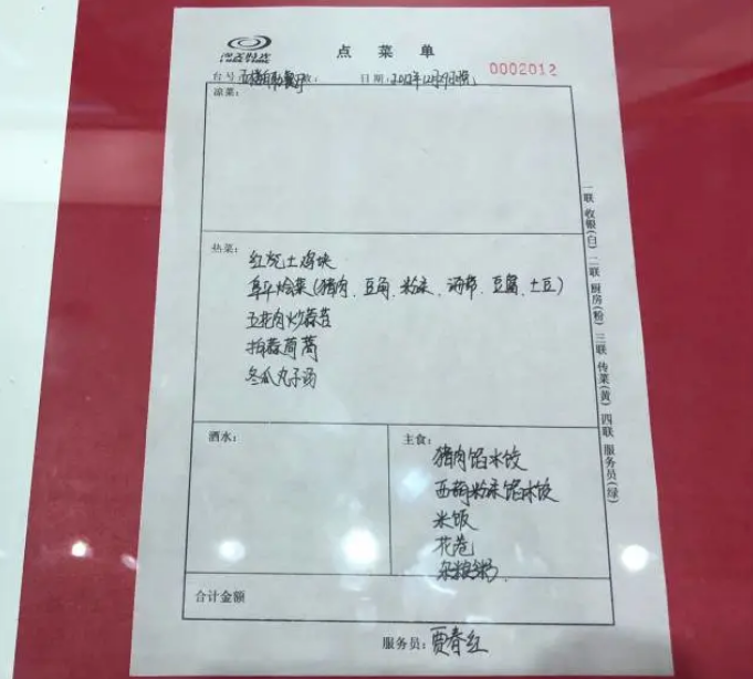 一張菜單,內容是標準的“四菜一湯”:紅燒土雞塊、阜平燴菜、五花肉炒蒜薹、拍蒜茼蒿、冬瓜丸子湯。主食也很簡單。落款日期是2012年12月29日。