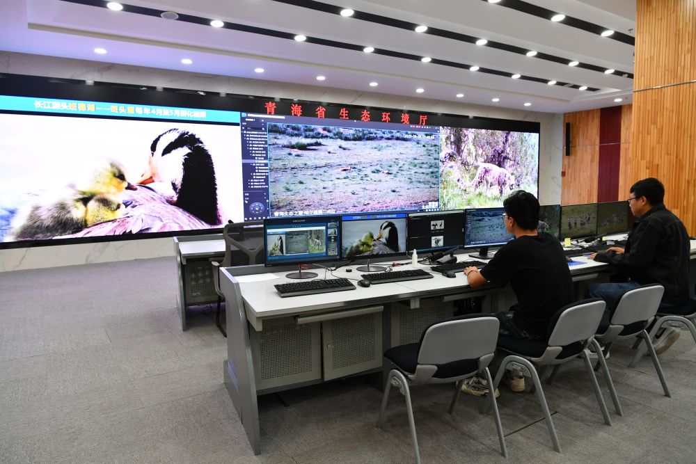 8月8日,青海省生態(tài)環(huán)境廳信息中心工作人員正在分析野生動(dòng)物監(jiān)測(cè)畫(huà)面。(劉紅 攝)