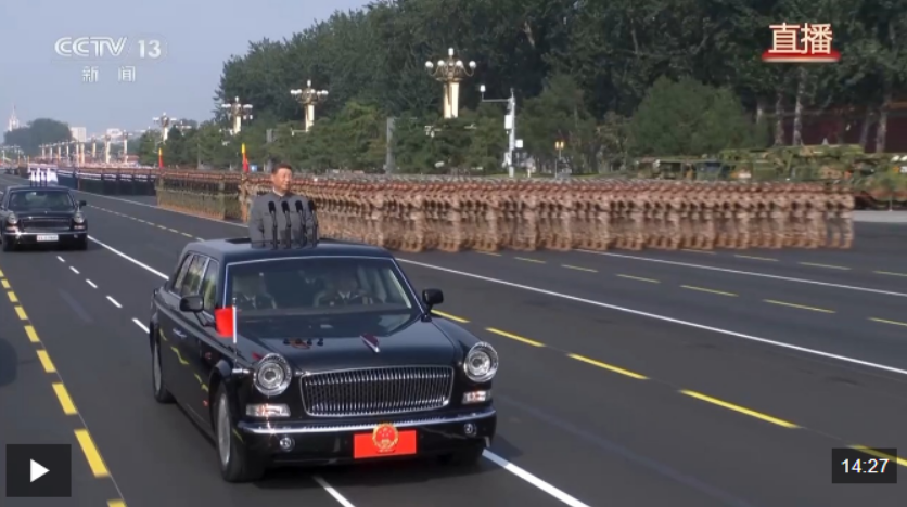 在雄壯的軍樂聲中,習(xí)近平乘車沿著寬闊的長(zhǎng)安街,依次檢閱徒步方隊(duì)和裝備方隊(duì)。
