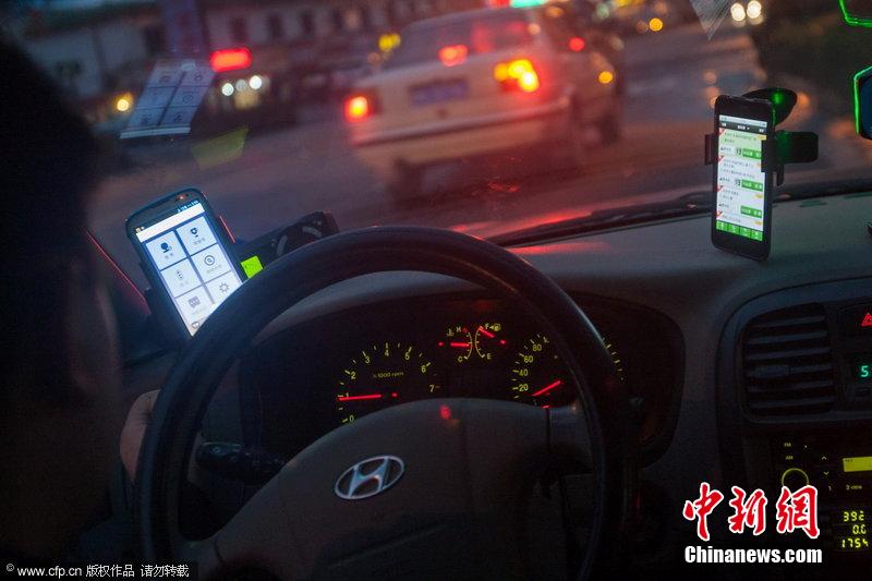 2014年2月19日,杭州,一位出租車司機同時開著兩款打車軟件。圖片來源:CFP視覺中國