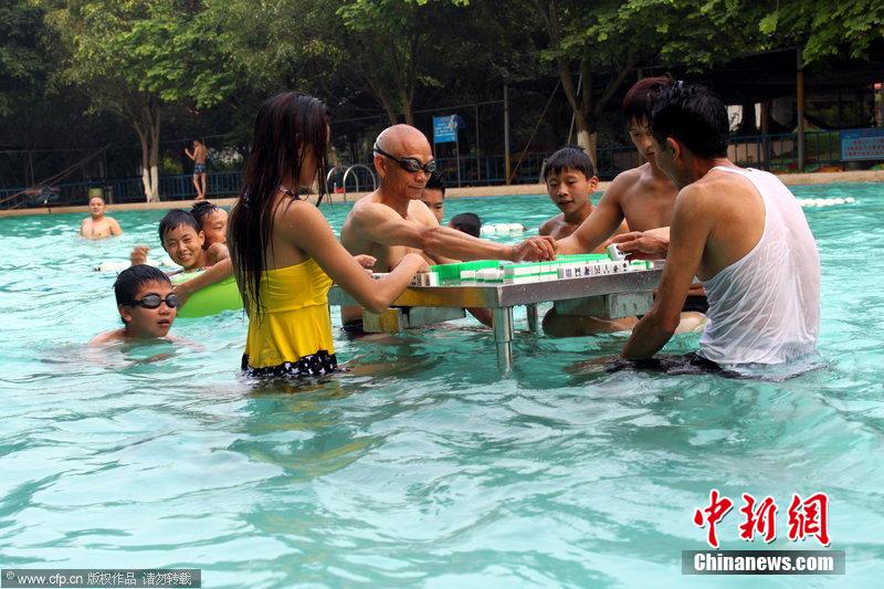 6月16日,廣東佛山。這幾天,廣東氣溫驟升,酷暑來臨,市民紛紛走出家門消暑。幾名游客竟然在游泳池里擺起了麻將臺,坐在水里搓麻將,既可娛樂,又可消暑,可謂是……