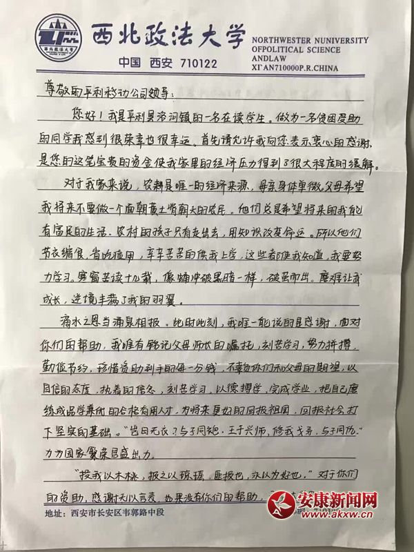 2016年11月24日一個(gè)平凡的日子里,一封從西北政法大學(xué)經(jīng)濟(jì)學(xué)院寄來(lái)的感謝信,“面對(duì)你們的幫助,我唯有銘記父母師長(zhǎng)的囑托,刻苦學(xué)習(xí),努力拼搏,勤儉節(jié)約,珍惜資助到手的每一分錢(qián),不辜負(fù)你們和父母的期望,以自信的態(tài)度,執(zhí)著的信念,刻苦學(xué)習(xí),以德博學(xué),完成學(xué)業(yè),把自己磨練成品學(xué)兼優(yōu)的合格有用人才,為將來(lái)更好的回報(bào)祖國(guó),回報(bào)社會(huì)打下堅(jiān)實(shí)的基礎(chǔ)。”她叫王梅,出生于一個(gè)貧困家庭的大學(xué)生,家住陜西省平利縣洛河鎮(zhèn)線(xiàn)河村一組,父親身患?xì)埣,母親體弱多病,家庭生活僅靠父母務(wù)農(nóng)、打短工維系,家庭月收入不足千元,尚有患精神病的外婆需要贍養(yǎng)。