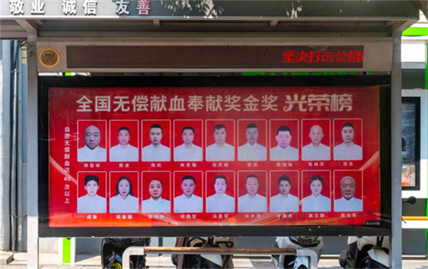 在第22個世界獻(xiàn)血者日到來之際,安康市中心血站精心策劃,自6月中旬起,在位于市政務(wù)大廳、市中心醫(yī)院、市中心醫(yī)院北院區(qū)門前的三處公交候車亭,以及中心城區(qū)兩處LED大屏上,全天循環(huán)展播著安康市榮獲“全國無償獻(xiàn)血奉獻(xiàn)獎”終身榮譽獎、金獎、銀獎、銅獎的獲獎?wù)叽盹L(fēng)采照片。