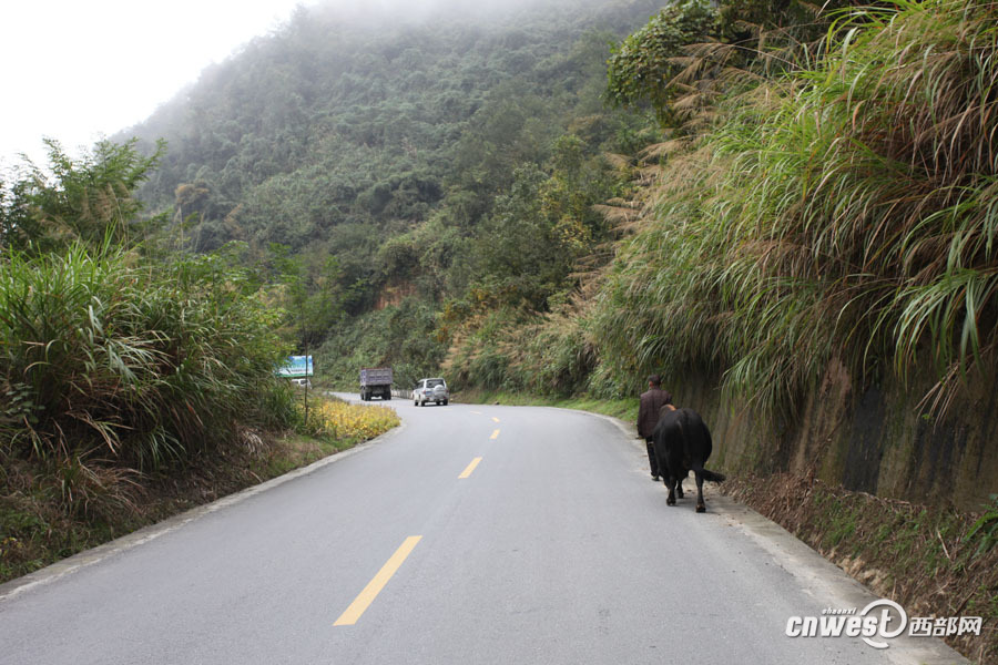 鄉(xiāng)村公路上的老農(nóng)和牛。
