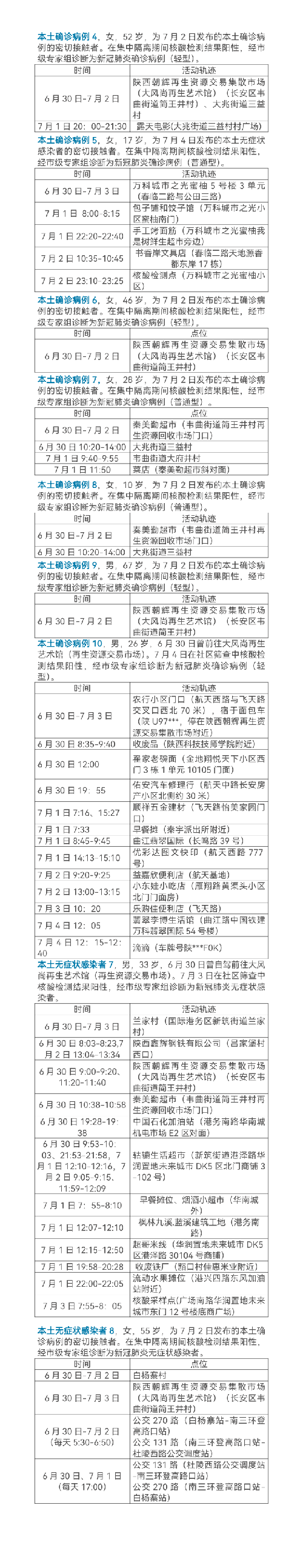 7月4日0-24時,西安市新增7例本土確診病例,2例本土無癥狀感染者,7例在集中隔離中發(fā)現(xiàn),2例在社區(qū)篩查中發(fā)現(xiàn)。主要活動軌跡如下: