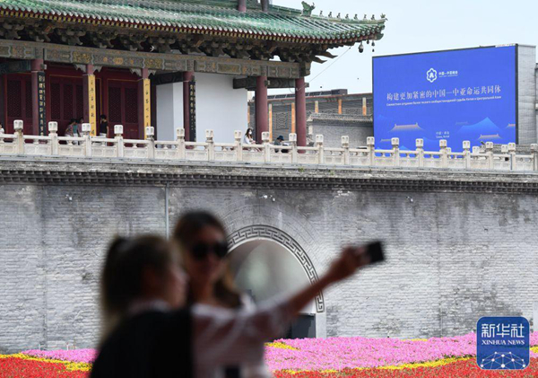 ↑5月16日,游客在西安市北大街上與中國-中亞峰會主題裝置合影。新華社記者 李一博 攝