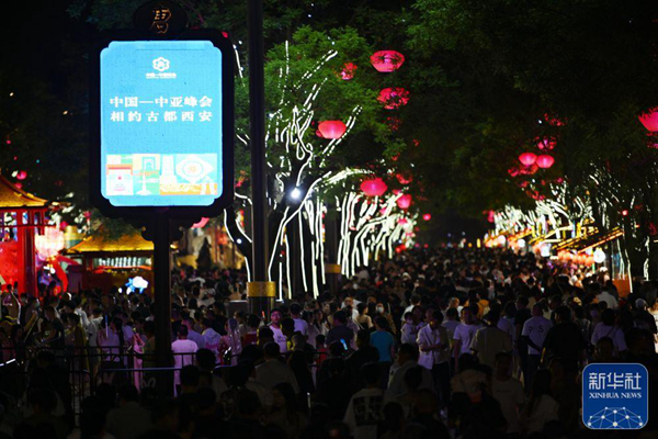 ↑5月15日,游客在西安市大唐不夜城游覽。新華社記者 張博文 攝