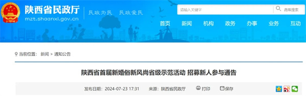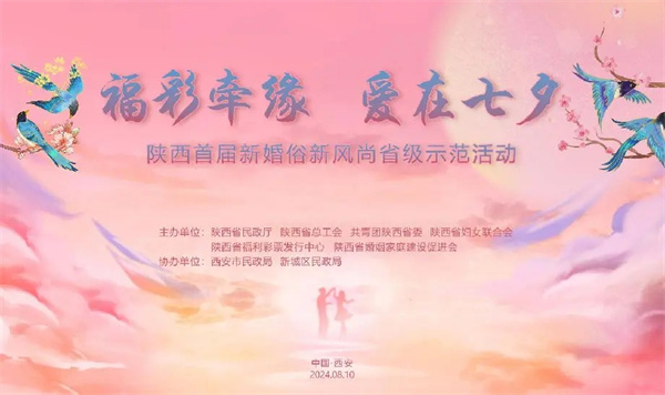 今年的8月10日,是中國(guó)傳統(tǒng)的七夕佳節(jié),為大力推進(jìn)婚姻領(lǐng)域移風(fēng)易俗,引導(dǎo)新人樹(shù)立文明、健康、理性的婚戀觀,陜西省民政廳等4部門計(jì)劃舉辦“福彩牽緣 愛(ài)在七夕”陜西省首屆新婚俗新風(fēng)尚省級(jí)示范活動(dòng),現(xiàn)面向全省招募新人。