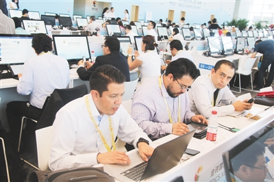 | 9月5日,第九屆金磚國家領(lǐng)導(dǎo)人廈門會晤閉幕,外國媒體積極報道會議進(jìn)程。圖為5日,來自墨西哥的多家媒體記者正在新聞中心忙碌。 |