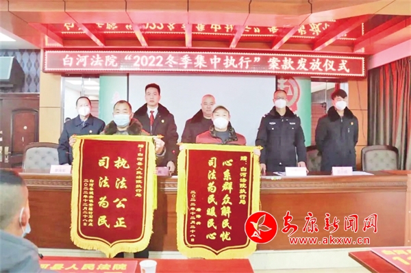 發(fā)放儀式上,通報(bào)了白河法院2022年冬季集中執(zhí)行行動(dòng)開展情況,對(duì)國(guó)家司法救助條件和程序進(jìn)行了詳細(xì)解讀, 32名申請(qǐng)執(zhí)行人領(lǐng)取了案款發(fā)款牌,發(fā)放儀式井然有序進(jìn)行。據(jù)悉,自2022年11月1日“冬季集中執(zhí)行行動(dòng)”開展以來,白河法院共執(zhí)結(jié)執(zhí)行案件474件,執(zhí)行到位金額9672.8萬元,共宣布拘留12人,將69人納入失信被執(zhí)行人名單,向78人發(fā)出限制消費(fèi)令。該院集中執(zhí)結(jié)涉民生案件142件,執(zhí)行到位金額153.2萬元,同時(shí)積極爭(zhēng)取資金,為困難申請(qǐng)人落實(shí)司法救助資金48.01萬元。