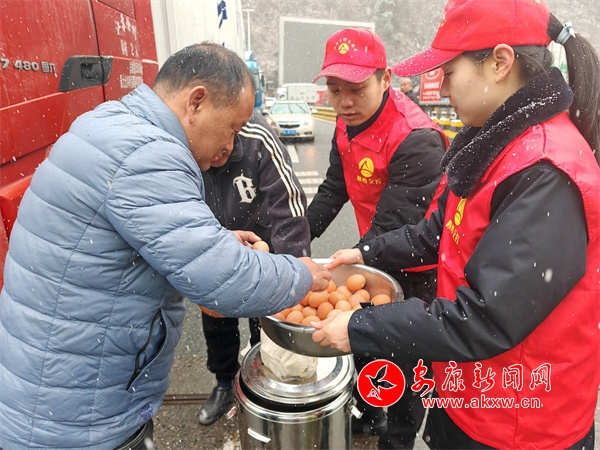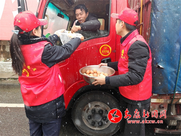 2月21日上午,降雪導(dǎo)致十天高速道路封閉,部分司機和乘客滯留在白河服務(wù)區(qū),陜西交控集團白泉分公司白河管理所組織青年志愿者為滯留司乘送去饅頭、雞蛋、姜湯等食物,讓滯留人員感受到了溫暖。(通訊員 張丹) eQt安康新聞網(wǎng)
