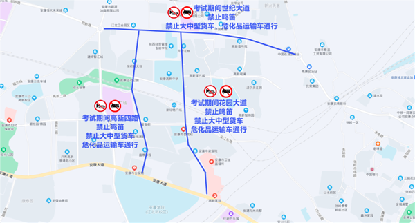 1、花園大道(安康大道至世紀(jì)大道)、世紀(jì)大道(新路口環(huán)島至五路口環(huán)島)、高新四路,所有通行車輛于6月6日21時(shí)至6月8日21時(shí),無(wú)論遇到何種情況,一律禁止鳴笛,禁止大中型貨車、;愤\(yùn)輸車通行。