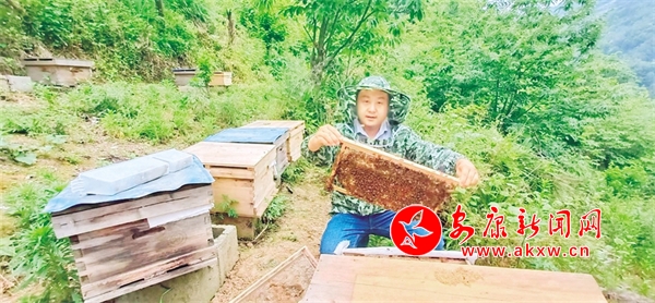 2016年,江鑫養(yǎng)了3箱蜜蜂,但由于經(jīng)驗不足,3箱蜜蜂飛跑了2箱,于是江鑫就按照河南夫妻的經(jīng)驗細心養(yǎng)殖,小心呵護,2017年由1箱蜜蜂繁殖發(fā)展到50多箱蜜蜂,在黃泥村“兩委”的支持下他還成立了養(yǎng)蜂合作社。2018年,又繁殖發(fā)展40箱蜜蜂,在漢濱區(qū)文化和旅游廣電局的幫扶指導(dǎo)下,江鑫同時享受了漢濱區(qū)扶貧政策的獎勵扶持資金8000元,當年賣出蜂蜜200多公斤,價格200元一公斤;2019年又發(fā)展200多箱蜜蜂,當年賣出了500多公斤蜂蜜,收入10多萬元,他自己也成了養(yǎng)蜂“土專家”,很多當?shù)乩习傩障蛩麑W習養(yǎng)蜜蜂的技術(shù),他毫不保留地傳授養(yǎng)蜂技術(shù),還給他們提供中華蜂種、蜂箱,幫助他們在網(wǎng)上銷售蜂蜜。目前,江鑫已經(jīng)帶動30多戶群眾一起發(fā)展“甜蜜”事業(yè)。