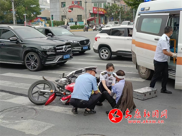6月2日下午6時(shí)許,漢濱區(qū)育才西路至瀛湖方向十字路口發(fā)生一起交通事故,一輛黑色奔馳越野車和一輛二輪摩托車發(fā)生相撞,騎摩托的男子被撞翻在地,面部頭部和嘴都受傷流血,當(dāng)時(shí)正值車輛高峰期,在此執(zhí)勤的江南交警中隊(duì)民警張聲榜第一時(shí)間撥打“120”救護(hù)車并和122事故處理中隊(duì),同時(shí)疏導(dǎo)交通避免造成堵塞。120救護(hù)車為傷者緊急處理后迅速送往醫(yī)院救治,目前事故原因正在進(jìn)一步調(diào)查中。(圖文/張樹進(jìn))