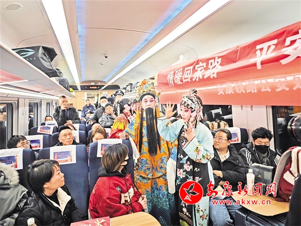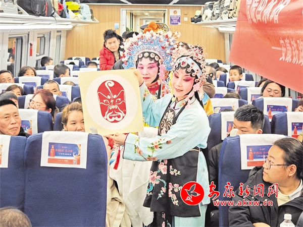火車穿越秦巴山水間,途中,來自安康漢調(diào)二黃研究院的專業(yè)演員和地方民間漢調(diào)二黃愛好者們一同表演了國家級非物質(zhì)文化遺產(chǎn)——漢調(diào)二黃經(jīng)典戲曲演唱,并為旅客們講解漢調(diào)二黃戲曲知識,與旅客們開展互動交流,讓旅客親身體驗漢調(diào)二黃戲服道具,感受漢調(diào)二黃的獨特藝術(shù)魅力。來自漢濱區(qū)文化館的漢濱剪紙技藝傳承人為旅客們展示講解了安康市級非物質(zhì)文化遺產(chǎn)——漢濱剪紙技藝,向參與互動的旅客送上了親手創(chuàng)作的漢濱剪紙作品,提前送上新春祝福;顒又,西安鐵路公安局安康公安處的民警們和文藝工作者們一同宣傳普及了反詐知識,進一步提升旅客的安全防范意識。
