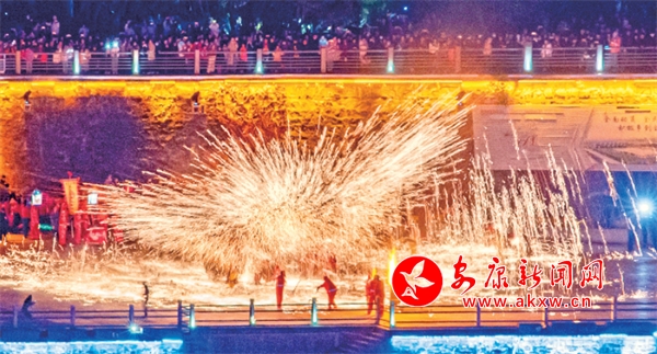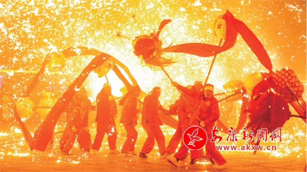 來自寧陜的打鐵花表演將現(xiàn)場氣氛推向高潮。寧陜縣民間社火協(xié)會副會長張宜君說:“在安康市區(qū)來一場打鐵花還是第一次。我們上場共有6個人,給全市人民打鐵花、拜新年。”