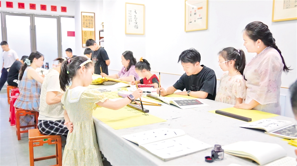 “我們來看下這‘海’字,是左右結(jié)構(gòu)的字,左邊的偏旁是一個(gè)三點(diǎn)水,三點(diǎn)水寫的時(shí)候要注意連貫性……”書法老師細(xì)致地拆解著漢字的書寫技巧,耐心指導(dǎo)著現(xiàn)場(chǎng)的每一位學(xué)員。