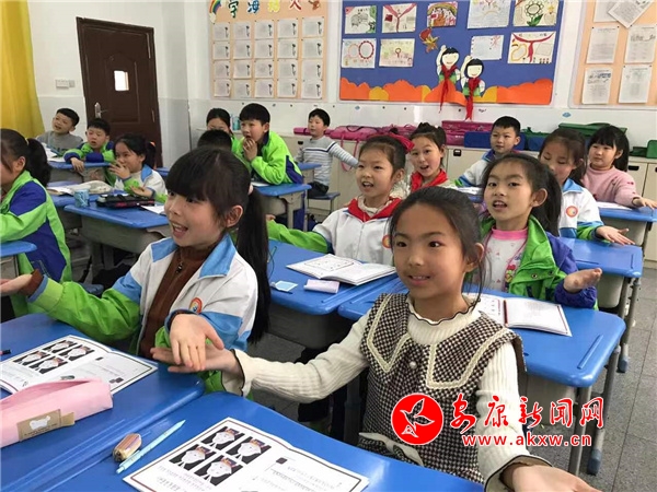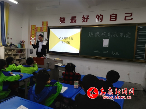 本網(wǎng)訊(通訊員 徐雯雯 鐘自坤)5月10日,漢陰縣鳳臺(tái)小學(xué)班主任郭老師拿著兩只小兔子玩偶,在講臺(tái)上聲情并茂地演繹心理故事,臺(tái)下的孩子們臉上掛著開(kāi)心的笑容。這是鳳臺(tái)小學(xué)一節(jié)主題為《我的好朋友》的心理健康課程。