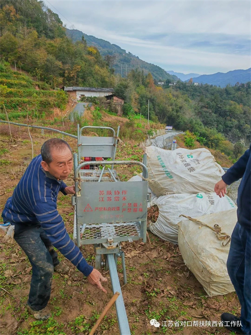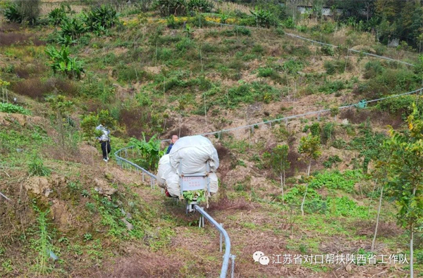 2022年,常州市新北區(qū)對口幫扶嵐皋縣聯(lián)絡組專門撥付蘇陜協(xié)作資金350萬元,為當?shù)匕l(fā)展獼猴桃、碧根果等產(chǎn)業(yè)的村子安裝山地軌道運輸車20公里,直接讓3500畝土地的種植戶受益。軌道運輸車的安裝,讓當?shù)厝罕姀拇烁鎰e了依靠人力肩挑背扛的歷史。包括獼猴桃、黃豆、紅薯等在內(nèi)的所有莊稼,從此在地里收獲后,只需要主人裝入軌道運輸車,就可以直接送到農(nóng)用車上,然后拉回家。