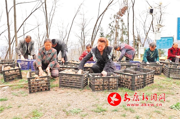 從福建跨省來嵐皋流轉(zhuǎn)土地種魔芋、收魔芋、加工魔芋的黃雪琴,與村民挑選種芋準備林下栽種。