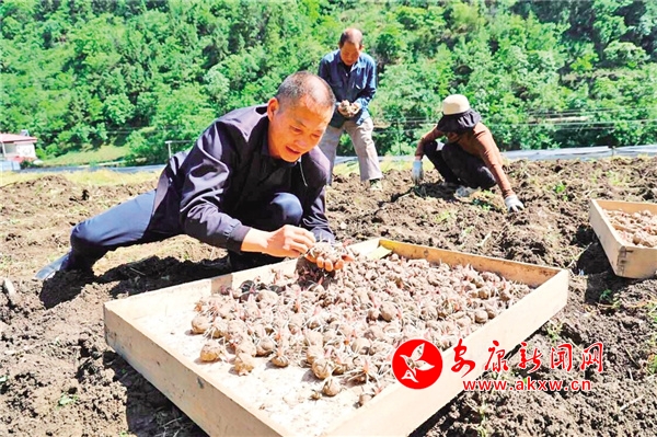 藺河鎮(zhèn)蔣家關(guān)村產(chǎn)業(yè)大戶、立新魔芋農(nóng)民專業(yè)合作社負責人的王永成,挑選基地培育適應當?shù)卦苑N高產(chǎn)魔芋種子下田。