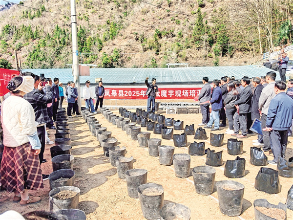 本網(wǎng)訊(通訊員 張?zhí)毂?胡興建)近日,在嵐皋縣藺河鎮(zhèn)蔣家關(guān)村五組藺佳源魔芋種植基地,一個(gè)個(gè)黑色塑料種植袋間隔有序地整齊擺放,隨著專家教授的現(xiàn)場(chǎng)講解,這種袋栽魔芋的新模式,讓前來(lái)參加2025年嵐皋縣魔芋現(xiàn)場(chǎng)培訓(xùn)會(huì)的百余名干部群眾眼前為之一亮。