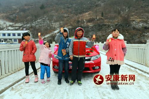 天空飄著雪花,迎親車隊緩緩前行,短短了2公里行程,走了20分鐘,中途不時有孩子們擋著喜車,問新娘子討要紅包和喜糖。車隊進入朱家咀村頭,早早等待在那里的孩子就前去報信,邊跑邊喊:新娘子來了!