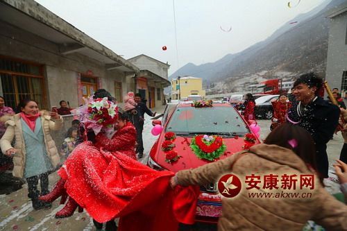安康新網(wǎng)訊(通訊員 楊寧 陳苗)1月29日早上7點半,家住寧陜縣城關(guān)鎮(zhèn)朱家咀村小堰組的武道勝來到了同村的黃靜家,他帶領(lǐng)著迎親的隊伍,來迎娶他的妻子黃靜。天公作美,為一對新人送去了象征純潔愛情的瑞雪,鋪滿了屋頂、道路。四面八方趕來的親朋好友齊聚一堂,共同分享了一對新人的喜悅!