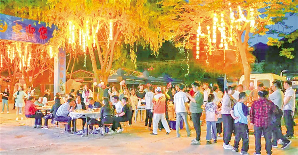 活動現(xiàn)場,本土樂隊(duì)、游客與特邀嘉賓輪番登臺,民謠、搖滾、電子樂交織回蕩。游客們圍著篝火載歌載舞,火光映紅張張笑臉,F(xiàn)場設(shè)置的文創(chuàng)產(chǎn)品和小龍蝦、燒烤等特色美食攤位更是滿足了游客的多重體驗(yàn)。