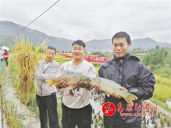 2019年開始,平利縣大貴鎮(zhèn)嘉峪寺村大力發(fā)展集體經(jīng)濟,當?shù)啬苋送蹉y在充分挖掘本地資源優(yōu)勢的基礎(chǔ)上,成立了寶銀種養(yǎng)殖專業(yè)合作社,依托良好的生態(tài)環(huán)境和區(qū)位優(yōu)勢,加之優(yōu)質(zhì)的山泉水,流轉(zhuǎn)土地種植500畝富硒水稻。經(jīng)過一年的發(fā)展,當年便收獲了20萬公斤稻谷,也贏得了廣闊的市場。2020年為進一步增加收入,王銀便萌生了養(yǎng)稻花魚的想法,組織寶銀種養(yǎng)殖農(nóng)民專業(yè)合作社采取“合作社+貧困戶”的模式,通過統(tǒng)一品種、統(tǒng)一種植、統(tǒng)一管理等方式,開啟“一田兩用、一水雙收”的發(fā)展模式,養(yǎng)殖生態(tài)稻花魚,陸續(xù)投放了20萬尾魚苗。稻因魚而優(yōu),魚因稻而貴。“稻田里養(yǎng)了魚,就不用農(nóng)藥和除草劑了,魚會吃掉稻田中的害蟲、雜草、掉落的稻花,排出的糞便又能成為水稻生長的肥料。”王銀說,稻田養(yǎng)魚實現(xiàn)了“一水兩用、一田多收、稻魚雙贏”。割稻時節(jié),稻香魚肥慶豐收,稻田里農(nóng)民兄弟們忙著收割打谷、捉魚,田埂旁搭起的臨時小舞臺上載歌載舞,歡聲笑語四處洋溢。