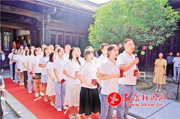 “和氣致祥”“真愛長春”“和鳴盛世”等書法作品為新人送上美好祝愿,以此倡導(dǎo)文明、健康、理性的婚戀觀和家庭觀,引導(dǎo)新人們感悟銘記婚姻締結(jié)之神圣、婚姻家庭之責(zé)任、婚姻和諧之美好,樹立社會新風(fēng)尚。“穿針乞巧”“曬書曬才”“編中國結(jié)”……一對對新人積極踴躍、各顯神通。手執(zhí)五色絲線,同時連續(xù)穿過五孔針,比一比誰能最先將線快速全部穿過針孔,期待“得巧”;巧手編織中國結(jié),傳承紅色中國情,七夕飛花與詩,情意綿綿,深遠(yuǎn)悠長。