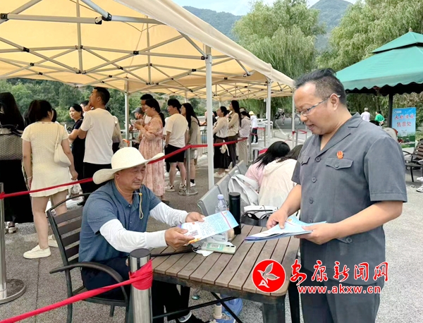 在各大景區(qū),法官干警給旅游景區(qū)的工作人員講解相關(guān)法律知識、教他們?nèi)绾我婪皶r(shí)處理與游客之間的矛盾糾紛,確保一旦發(fā)生旅游糾紛,第一時(shí)間有人報(bào)告、第一時(shí)間有人接待、第一時(shí)間有人解決。向來往游客和景區(qū)工作人員發(fā)放旅游法宣傳手冊,對游客較為關(guān)注的“旅游者的權(quán)利、旅行社的義務(wù)、旅游安全如何保障、旅游糾紛如何解決”等進(jìn)行詳細(xì)解答,并向游客積極熱情解答各類法律咨詢。