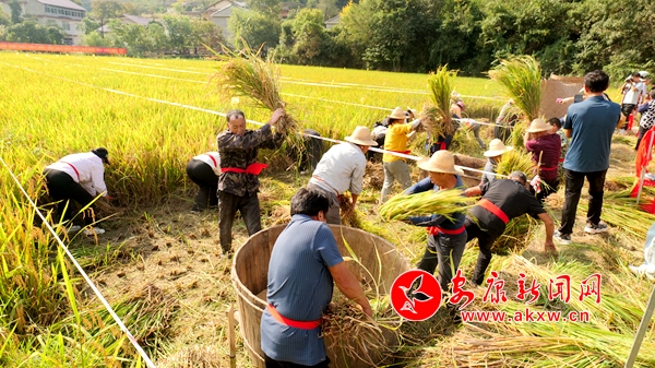穗滿田頭谷滿倉(cāng),稻魚(yú)飄香慶豐年。稻田里,緊張激烈、歡快熱鬧的割稻、甩谷及釣魚(yú)比賽正在進(jìn)行,只見(jiàn)一株株水稻隨著鐮刀的刷刷聲倒下,一把把稻穗隨著摔打脫落為金色的谷粒,一條條稻魚(yú)在手中躍動(dòng),大家爭(zhēng)分奪秒、你追我趕,一派熱火朝天的景象。