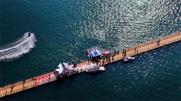 游客輾轉(zhuǎn)至瀛湖浮橋,水上運(yùn)動中心也已喬遷至此。精彩刺激的水上項(xiàng)目,吸引了年輕人的極大興趣。水上摩托艇、水上陀螺、水上拖傘。以及靜態(tài)水域的水上滾筒、水上皮劃艇、水上手搖船,都成了游客今年第一次親水的最佳載體,怎一個酣暢了得。