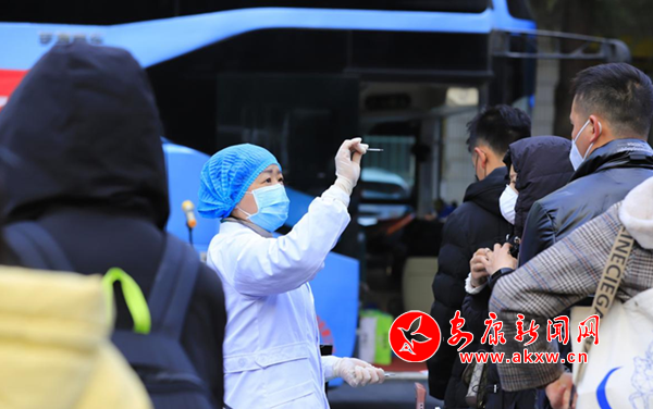 上午8點(diǎn),帶著行李、佩戴口罩的返崗人員們齊聚在縣中心廣場(chǎng)。在該縣人社局工作人員的組織下,員工們有序地依次經(jīng)過(guò)體溫檢測(cè)、身份核實(shí)、個(gè)人健康狀況查驗(yàn)、安全檢查,踏上返崗復(fù)工復(fù)業(yè)的旅程。