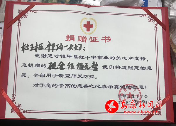 本網(wǎng)訊(通訊員 韋慰)今年以來,新型冠狀病毒感染的肺炎疫情牽動著每一個人的心,3月18日,家住鎮(zhèn)坪縣城關(guān)鎮(zhèn)上新街竹溪河社區(qū)的88歲退休老干部杜正樞慎重地將500元現(xiàn)金交給鎮(zhèn)坪縣紅十字會工作人員,并囑咐其要把錢用于支持疫情防控,為疫情防控獻一份力。