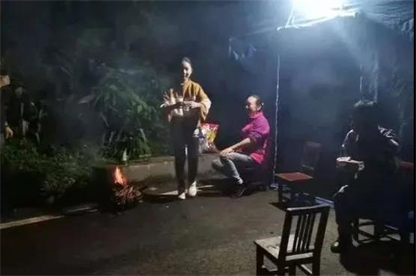 村民大姐帶女兒送來火盆和茶水