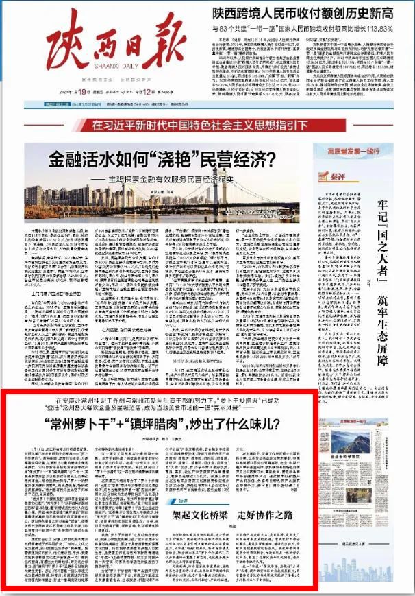 1月19日《陜西日報》頭版刊發(fā)文章《“常州蘿卜干”+“鎮(zhèn)坪臘肉”,炒出了什么味兒?》,報道鎮(zhèn)坪縣聯(lián)手常州市以文化賦能“土特產(chǎn)”,讓蘇陜協(xié)作更出彩!XMt安康新聞網(wǎng)