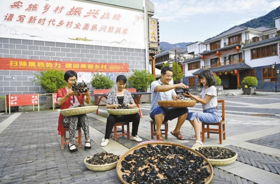(七月三十一日, 在鎮(zhèn)坪縣聯(lián)合村的巴山臘味小鎮(zhèn),村民楊大兵(右二)與家人正在清洗巖耳。巴山臘味小鎮(zhèn)是陜西省十二個農村特色產業(yè)小鎮(zhèn)之一,每年吸引不少省內外……