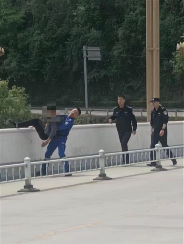 在吳勇抱住輕生男子的瞬間,身后的民警和群眾也立即沖上前幫忙,合力將該男子救援至護欄內的人行道上,成功挽救了一條生命,化解了一個家庭的悲劇。救援結束后,男子被民警帶回城關派出所進行耐心安撫與勸解,目前,該男子情緒已逐漸平穩(wěn)。