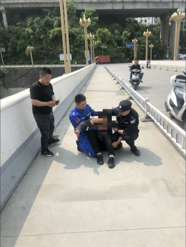 4月17日上午十一點左右,紫陽縣城紫陽港大橋上發(fā)生了驚險一幕,只見一名中年男子蹲在大橋護欄上,情緒激動,單手抓住大橋欄桿外圍,欲跳河輕生。